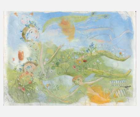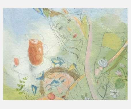 Ζέφυρος και Χλωρίδα, ολόκληρο το έργο (1), λεπτομέρειες (2&3). Αβγοτέμπερα και μολύβια σε βαμβακερό χαρτί, 50x70 εκ., 2014