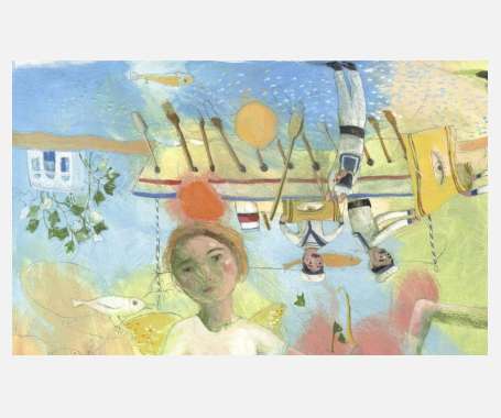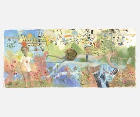 Ύλας και Δρυόπη, ολόκληρο το έργο (1), λεπτομέρειες (2&3). Αβγοτέμπερα και μολύβια σε βαμβακερό χαρτί, 70x152 εκ., 2014