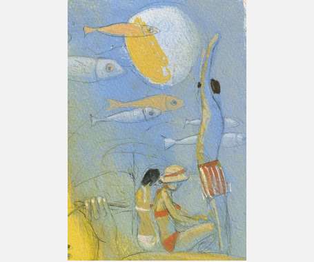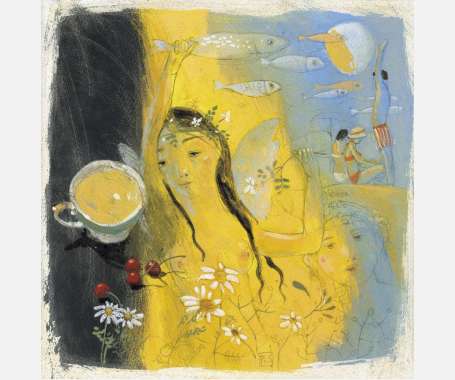 Ήλιος και Νέαιρα, ολόκληρο το έργο (1), λεπτομέρειες (2&3). Αβγοτέμπερα και μολύβια σε βαμβακερό χαρτί, 35x35 εκ., 2015