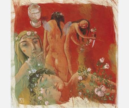«Η λεπίδα γυαλίζει στο ημίφως. Ανοίγει το παράθυρο, πετάει το μαχαίρι και τον πλησιάζει. Φρέσκος αέρας μπαίνει στην κάμαρα. Θροΐζει το νυχτικό της κοντά στο πρόσωπό του...» ΦΣ, βιβλίο ΕΡΟΣ ΜΥΘΟΠΛΟΚΟΣ